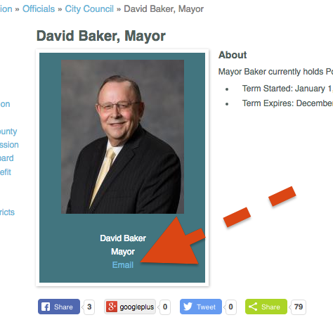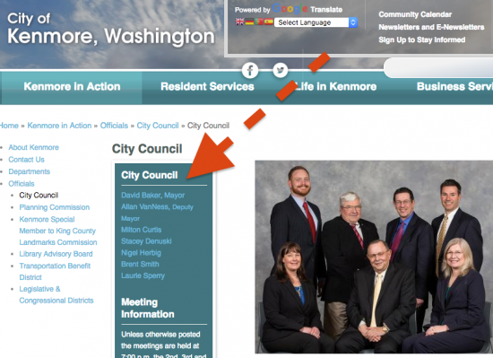 Follow this link to the City of Kenmore web site and find the council members' email addresses as shown below: